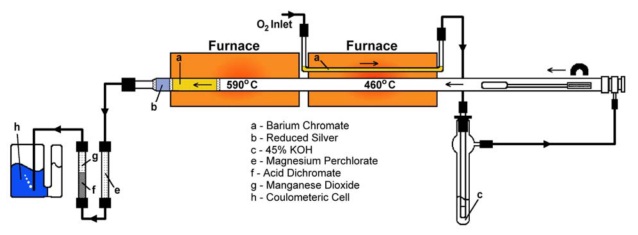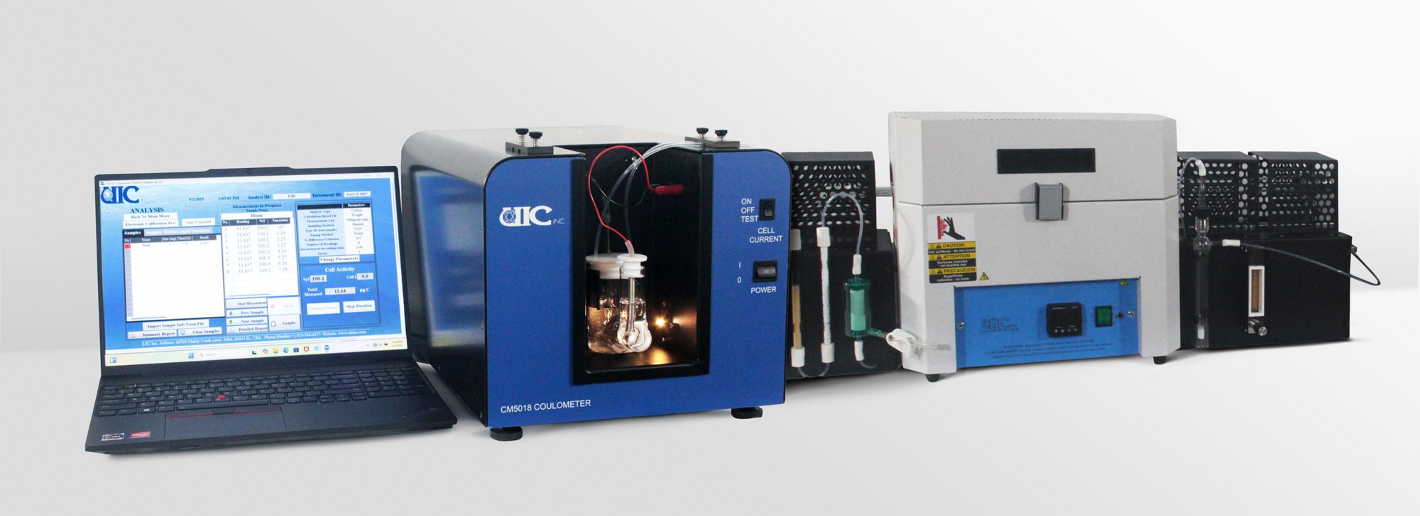 A variable volume, constant rate syringe is used to introduce the sample into the high temperature oxygen atmosphere (typically 950OC) within the sample combustion zone. In that environment, all carbon within the sample is rapidly oxidized to CO2. Interfering reaction products (including sulphur oxides, halides, water and nitrous oxides) are removed by the post-combustion scrubbers. The resulting carbon dioxide is then swept into the CM5018 CO2 Coulometer where it is automatically measured using absolute coulometric titration.