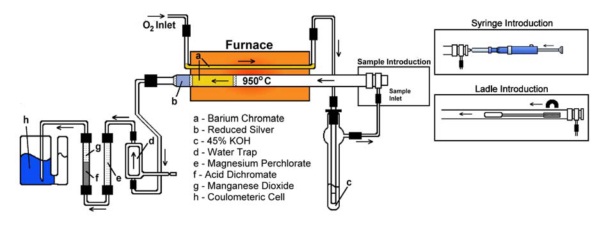 The sample is initially weighed into a platinum or porcelain “boat”. The boat is then placed into a quartz ladle which is introduced into the high temperature oxygen atmosphere (typically 950ºC) within the sample combustion zone. In that environment, all carbon within the sample is rapidly oxidized to CO2. Interfering reaction products (including sulfur oxides, halides, water and nitrous oxides) are removed by the post-combustion scrubbers. The resulting carbon dioxide is then swept into the CM5018 CO2 Coulometer where it is automatically measured using absolute coulometric titration.